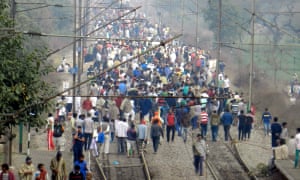 People from the Jat community block the rail track near Sonipat railway station during the protest in Haryana.